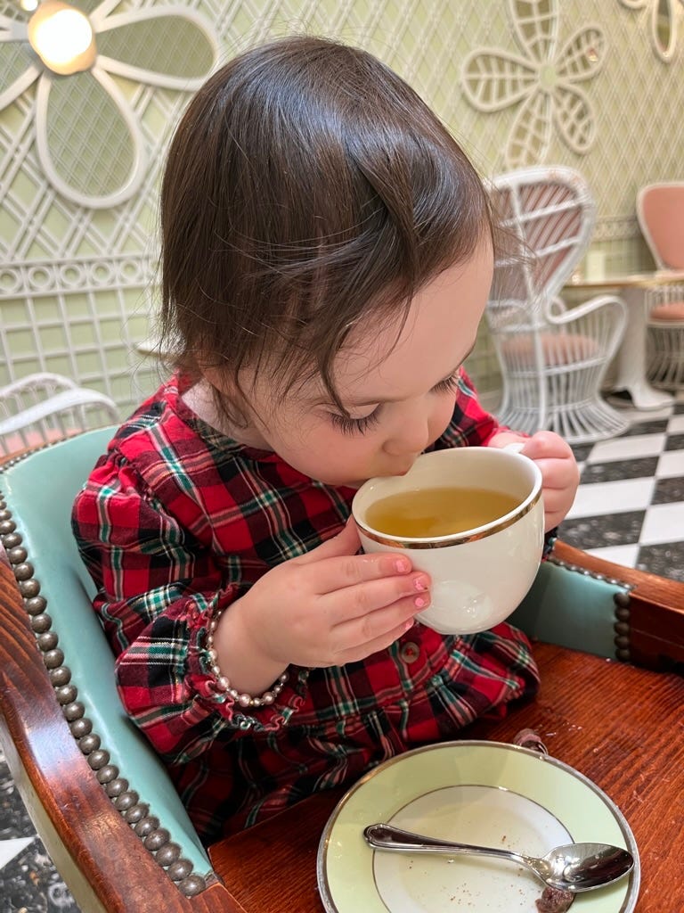 For Valentine’s Day when my daughter was 2.5, my mom and I took her to Laduree in Beverly Hills for tea and macarons. They sat her in what we immediately called “the princess high chair” and she had such a blast being fancy and eating yummy tea sandwiches and macarons. The staff let her drink her herbal tea from a real ceramic cup, too.” 🫖